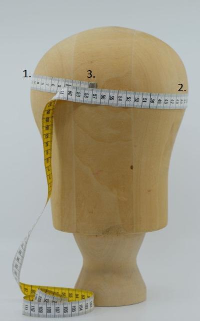 Hattstorleken mäter du med ett måttband, vågrätt runt huvudet från mitten av pannan ovanför ögonbrynen, där huvudet är som bredast. Se bilden nr 1.​