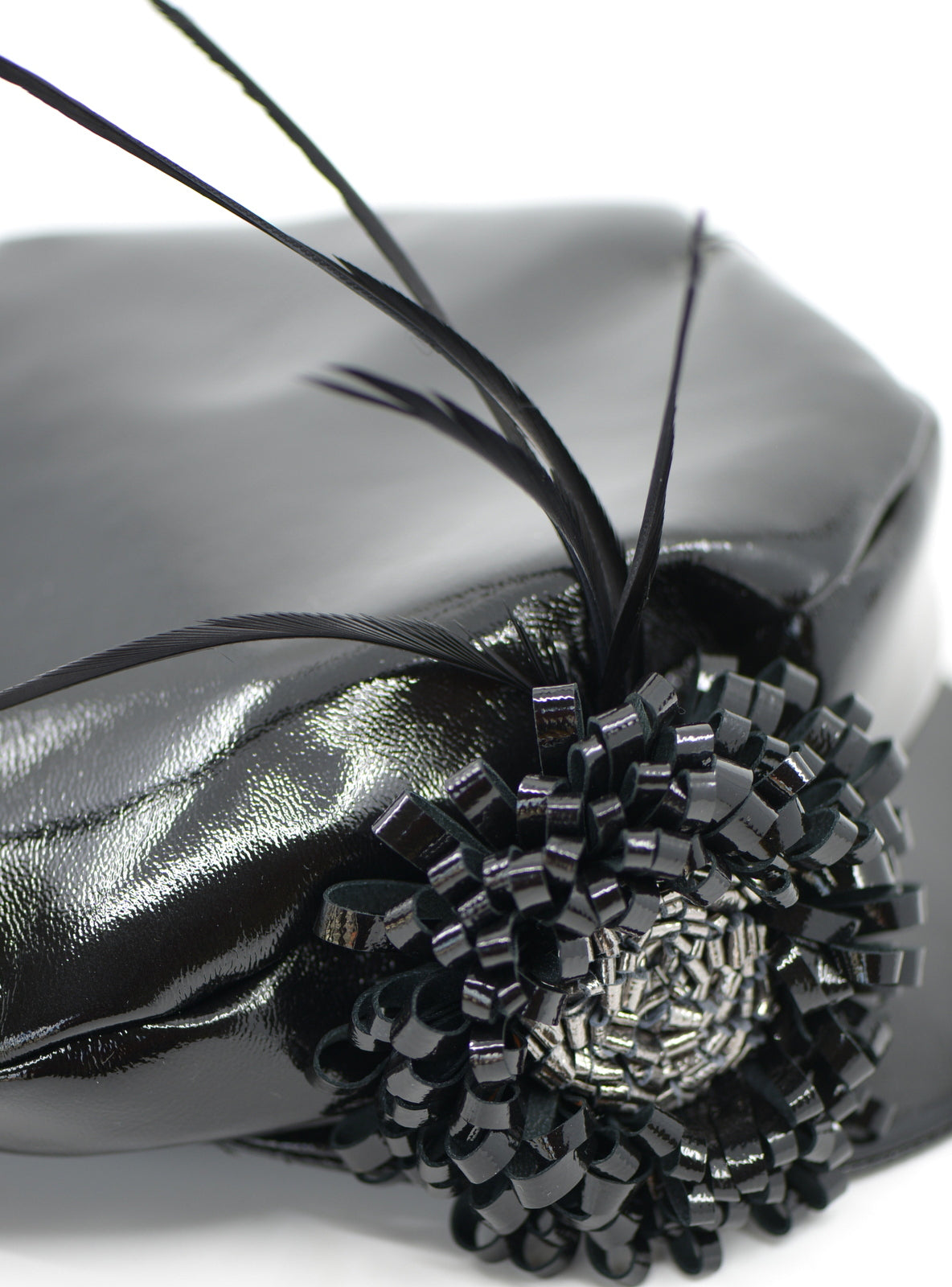 - Dekorations blomma tillverkad av svart lackskinn och matt silverskinn.
